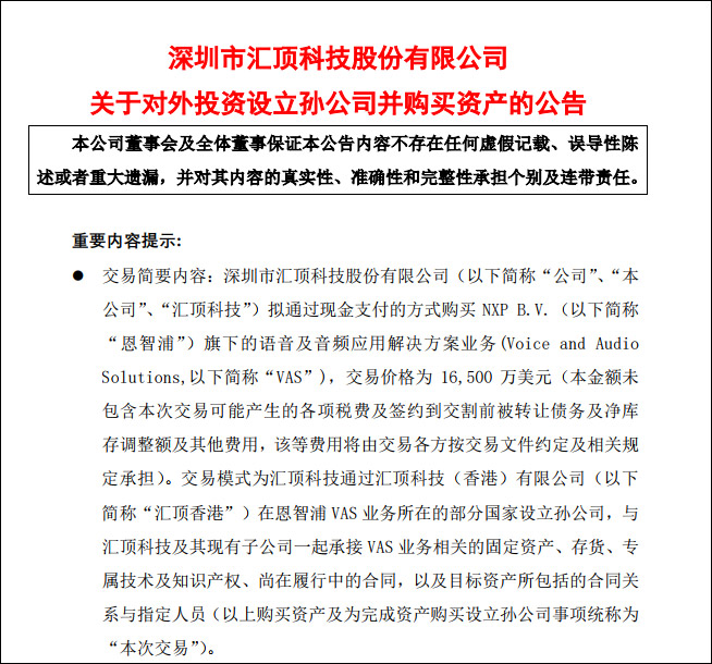 12月4日,深圳市匯頂科技股份有限公司(以下簡稱“匯頂科技”)發佈公告稱,公司收購荷蘭NXP B.V.(以下簡稱“恩智浦”)旗下語音及音頻應用解決方案業務(VAS)已獲中國監管部門批准。