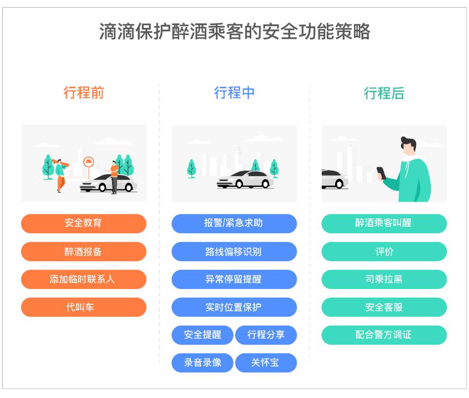 自2018年9月4日以來,滴滴APP推出、升級20餘個安全功能和策略,嘗試推出了“加密行程錄音、錄像” “黑名單”等新功能。
