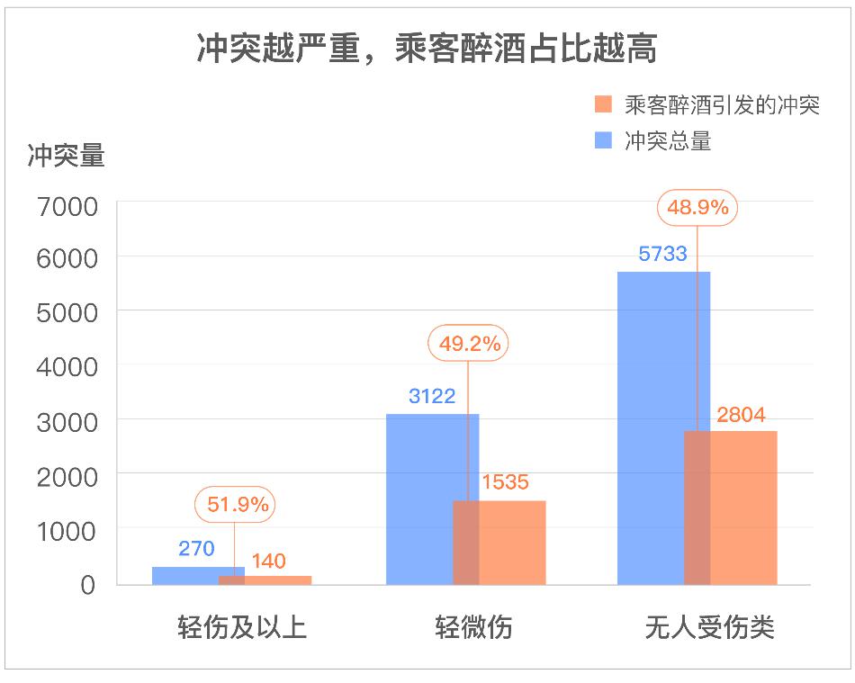 報告顯示,在越嚴重的衝突中,乘客醉酒佔比越高。2019年1-3季度,有人受輕傷及以上的衝突投訴中,由醉酒引發的佔比51.9%;有人受輕微刮傷的衝突投訴中,由醉酒引發的佔比49.2%;言語衝突投訴中,由醉酒引發的佔比48.9%。