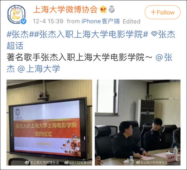 12月4日,上海大學微博協會官方微博發文宣佈歌手張傑入職上海大學電影學院,並曬出簽約儀式的現場照片。