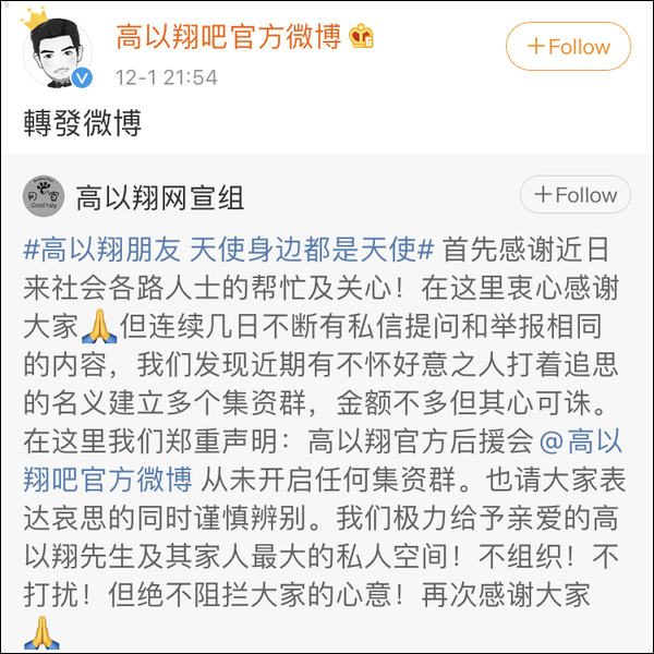 對此,@高以翔吧官方微博 和@高以翔網宣組 發文強調,從未開啓任何集資羣,請粉絲表達哀思的同時謹慎辨別。