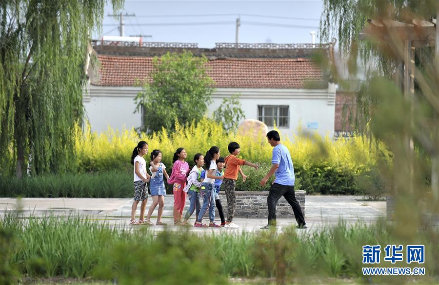 寧夏永寧縣原隆村的孩子們在新居前的休閒廣場上玩耍(2018年8月攝)。新華社記者 劉軍喜 攝