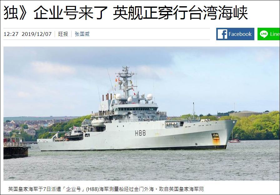 台灣《旺報》12月7日中午報道稱,該報接獲海峽商船人士通報,英國皇家海軍當天派遣“企業號”(H88)海軍測量船經過金門外海,當時正通過台灣海峽。
