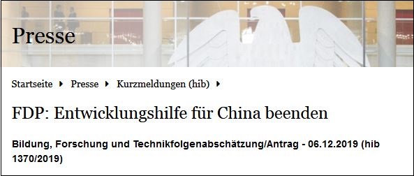 12月6日,自民黨又在德國議會提交了一份動議,對中國“發展中國家”的身份進行了無理質疑,稱中國是全球商品和金融市場上最重要的參與者,因此要求德國和歐盟“審查”與中國的合作項目,叫停對中國援助貸款。