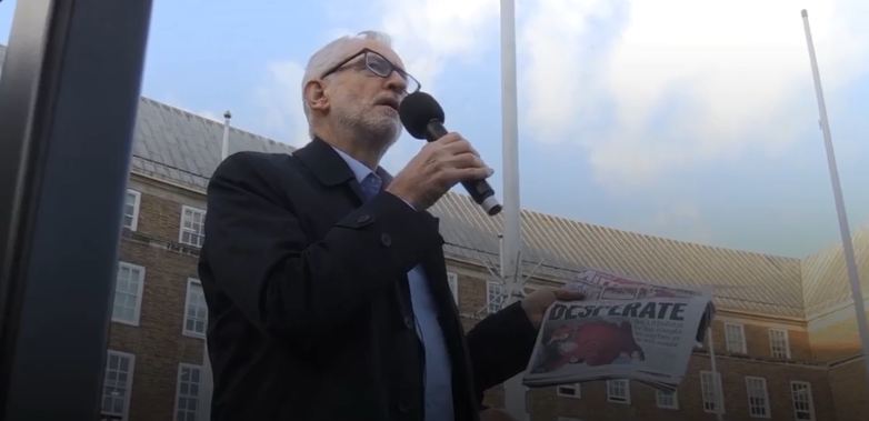 傑克的照片流傳開之後,**科爾賓還舉着用此照片作為頭版頭條的《鏡報》,在英國街頭為自己的競選造勢。**他説,這張照片是英國的“恥辱”,“我們需要給我們的公共服務投資”。