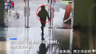 當聽到警報拉響時,北川永昌幼兒園一位老師立刻衝向教學樓,逆着疏散人羣衝進教室,準備組織教室內小朋友緊急避險。監控正好拍下了這一幕。