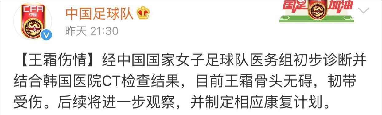 聲明表示,經中國國家女子足球隊醫務組初步診斷並結合韓國醫院CT檢查結果,目前王霜骨頭無礙,韌帶受傷。後續將進一步觀察,並制訂相應康復計劃。