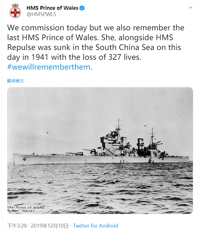 “威爾士親王”號的推特官方賬號,也紀念了這位英勇戰沉在南海地區的老艦