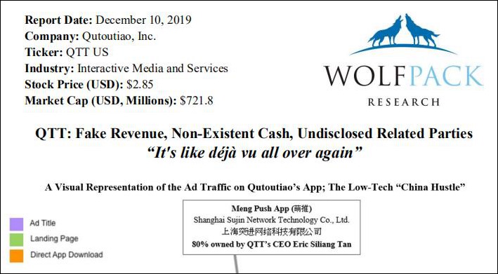 日前,又一家中資企業“趣頭條”(Nasdaq:QTT)被做空機構Wolfpack Research做空。Wolfpack指責趣頭條存在欺詐行為,大部分的營收和現金餘額均為造假。