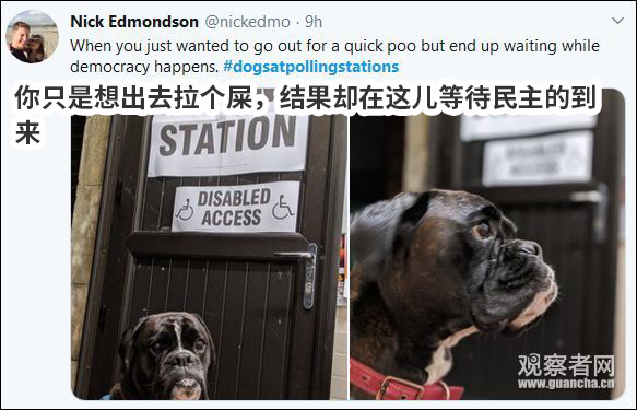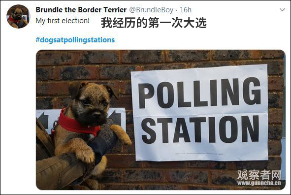 據英國廣播公司(BBC)12日報道,當天,許多主人牽着他們的狗狗前往投票站投票,推特上“狗狗在投票站”(dogsatpollingstations)的話題也逐漸流行起來,這幾乎是一種“選舉傳統”。