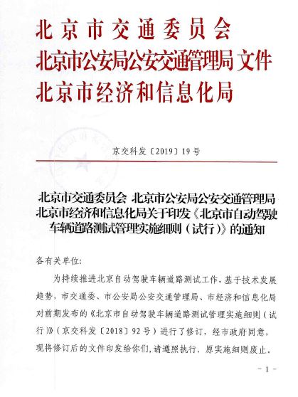 12月13日,北京市交通委聯合北京市公安交管局、北京市經濟信息委等部門,印發了新的《北京市關於加快推進自動駕駛車輛道路測試有關工作的指導意見(試行)》和《北京市自動駕駛車輛道路測試管理實施細則(試行)》,同時,原實施細則也由此廢止。