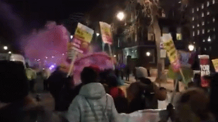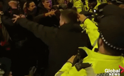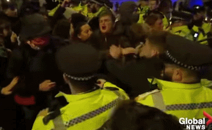 據英國《衞報》當地時間12月13日報道,當天晚上,數百名抗議者在倫敦市中心遊行,從唐寧街大門外到維多利亞大街、特拉法爾加廣場、議會廣場……他們手持標語,高喊“不要當我的首相”、“歡迎移民和難民”等口號。警察拿着警棍阻擋人羣,但有的抗議者衝破警戒線,雙方發生衝突。