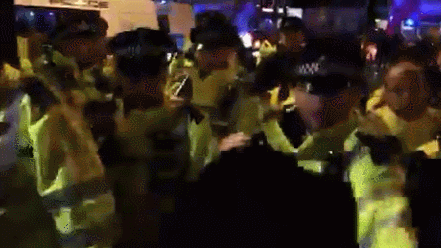 當天晚上,另一場反法西斯行動的示威者也在後來抵達唐寧街。隨着抗議者越來越多,有數百人湧入街道,包圍一支警察隊伍。警方開始動用警棍,抗議者最終得以突破警戒線。