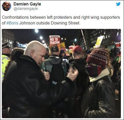 13日下午5點剛過,約翰遜的右翼支持者,就與一羣左翼抗議者在唐寧街外發生衝突。一小羣親保守黨的支持者慶祝選舉,但另一邊,數百名抗議者手持標語牌,高喊“歡迎移民和難民”(migrants and refugees welcome here)、“種族主義滾出我們的街道”(Racist scum, off our streets)。