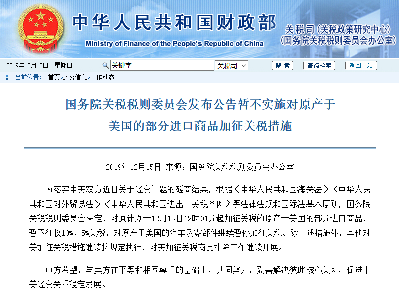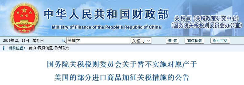 財政部網站12月15日消息,國務院關税税則委員會當天發佈《國務院關税税則委員會發布公告暫不實施對原產於美國的部分進口商品加徵關税措施》(下稱:措施)和《國務院關税税則委員會關於暫不實施對原產於美國的部分進口商品加徵關税措施的公告》(下稱:公告)。