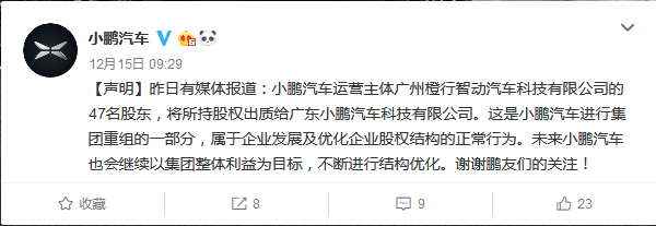 日前,有媒體報道稱“造車新勢力”小鵬汽車的47名股東將所持股權全部出質,引發外界的種種猜測。對此,12月15日,小鵬汽車在官方微博上回應稱,小鵬汽車運營主體廣州橙行智動汽車科技有限公司的47名股東,將所持股權出質給廣東小鵬汽車科技有限公司。這是小鵬汽車進行集團重組的一部分,屬於企業發展及優化企業股權結構的正常行為。未來小鵬汽車也會繼續以集團整體利益為目標,不斷進行結構優化。
