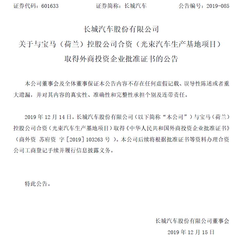12月15日,長城汽車發佈公告顯示,12月14日,長城汽車股份有限公司與寶馬(荷蘭)控股公司合資(光束汽車生產基地項目)取得《中華人民共和國外商投資企業批准證書》(商外資蘇府資字[2019]103263號)。