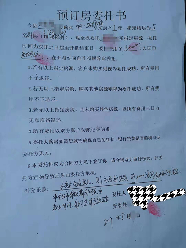 澎湃新聞拿到的四份“預定房委託書”顯示,這一費用名義為“服務費”或“中介費”,費用9萬到18萬不等,簽訂日期最早在今年5月份。