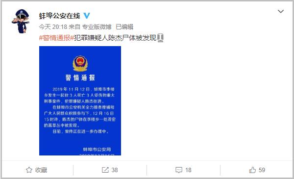 安徽省蚌埠市公安局網安支隊官方微博(@蚌埠網警巡查執法)12月16日發佈情況通報稱,2019年11月12日,蚌埠市李樓鄉發生一起致3人死亡3人受傷的重大刑事案件,犯罪嫌疑人陳杰在逃。