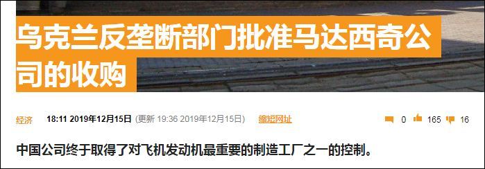 實際上,根據烏克蘭國家通訊社15日的報道,烏克蘭航空發動機企業馬達西奇公司(Motor Sich)總裁博古斯拉耶夫當天表示,已將公司股份出售給了中國企業。中國企業承諾,將在2年內對其投資2.5億美元。烏通社消息稱,中企取得的馬達西奇股份超50%。