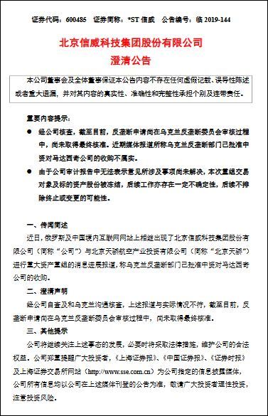 近日,俄羅斯及中國境內互聯網網站上相繼出現了北京信威科技集團股份有限公司(簡稱“公司”)與北京天驕航空產業投資有限公司(簡稱“北京天驕”)進行重大資產重組的消息進展報道,稱烏克蘭反壟斷部門已批准中資對馬達西奇公司的收購。