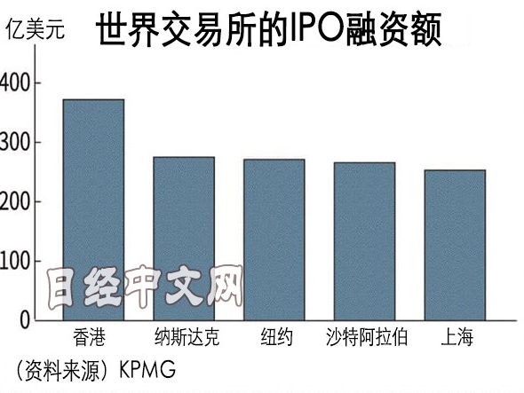 據《日本經濟新聞》12月16日報道,會計師事務所畢馬威(KPMG)日前統計了世界各交易所的IPO融資額預期。2019年,香港交易所融資額達到372億美元,創出9年來最高水平,連續2年排在首位。之後,依次是美國納斯達克、紐約、沙特和中國上海證券交易所。
