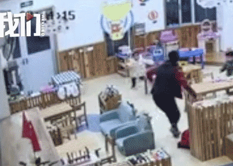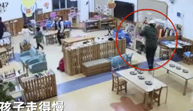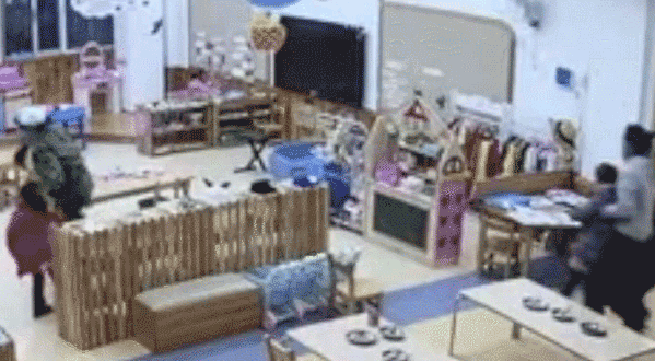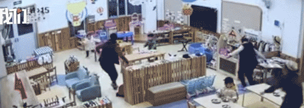 另外一名老師急忙拎起一個學生,又將旁邊蹲着的小朋友拽起來一起跑出去;