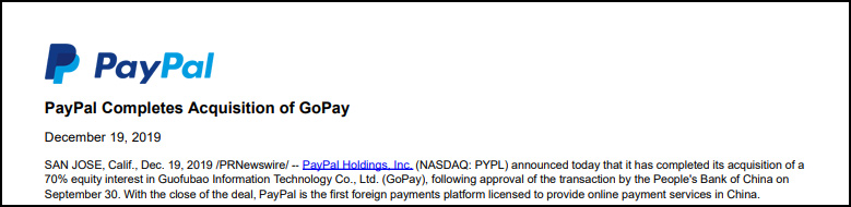 當地時間12月19日,貝寶(NASDAQ:PYPL)宣佈已完成對國付寶70%股權的收購。交易完成後,該公司成為首個獲准在中國提供在線支付服務的國外支付平台。