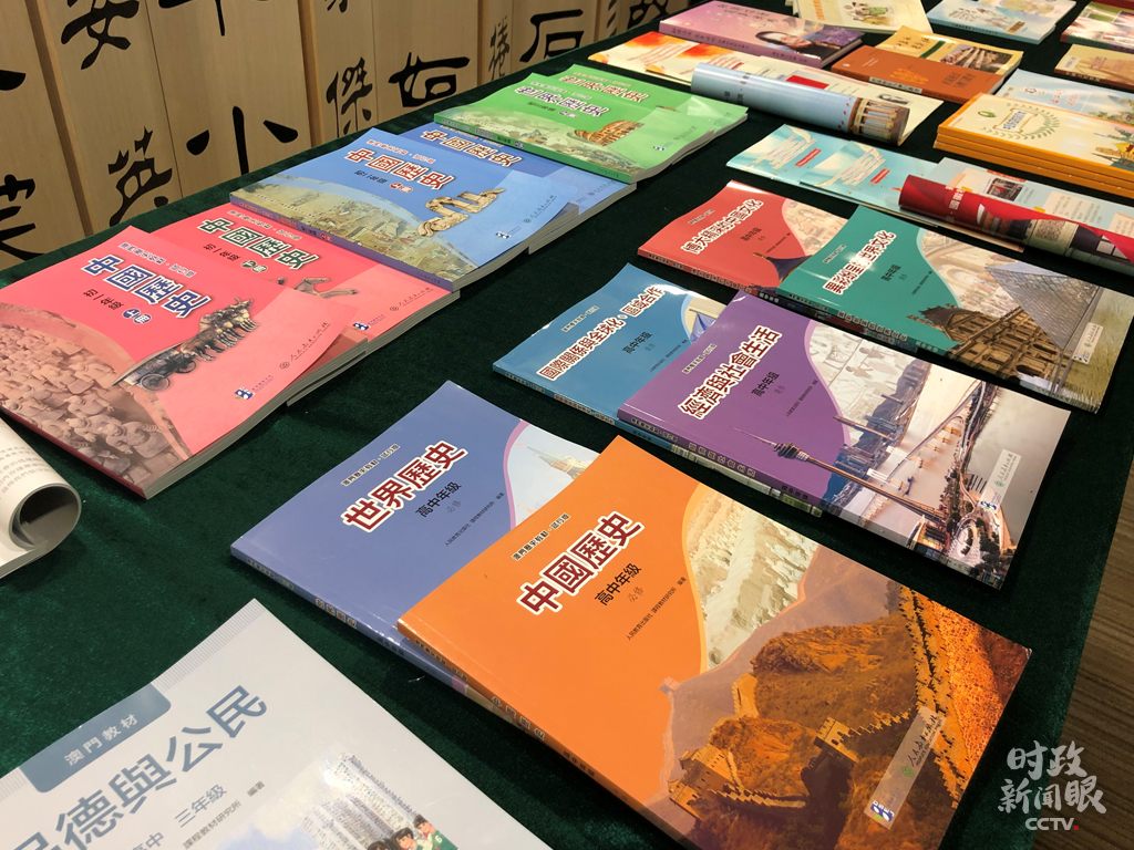 △在英才學校圖書館展台上,擺放着《品德與公民》、《中國歷史》等澳門特別行政區政府和內地合編的教材。(央視記者郭曉龍拍攝)