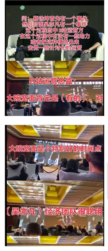12月18日,“2019第四屆中國新文娛-新消費年度峯會”在北京舉行,活動期間的一場媒體對話中,主持人向B站UP主運營部總監皮力提問:“蔡徐坤首先有一個事件,然後後面吳亦凡有一個事件,B站在這個過程中有沒有一些助力,去做一些針對化的運營?比如説《大碗寬面》這件事。”