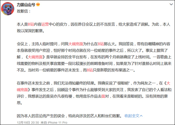 對此,皮力@力拔山山兮 19日發文道歉稱:事實上據他了解,《大碗寬面》是早就安排的全平台發佈,在發佈的兩個月前就確定了上線時間,如果是為了針對誰,時間上來不及。當時另一位明星的事件還未發生,而B站只是新歌的發佈渠道之一。