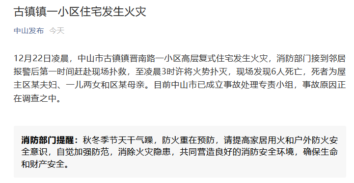 廣東中山古鎮鎮官方政務公眾平台——微信公號“燈都古鎮”今早(12月22日)發佈消息,12月22日凌晨,中山市古鎮鎮晉南路一小區住宅發生火災,消防部門2時3分接報後第一時間派員撲救,至凌晨3時許明火被撲滅,現場清理過程中發現6人死亡。目前火災原因正在調查中。
