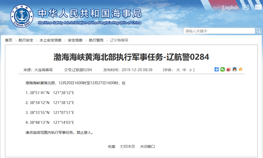 中國海事局:12月20至27日在渤海黃海執行軍事任務,禁止駛入