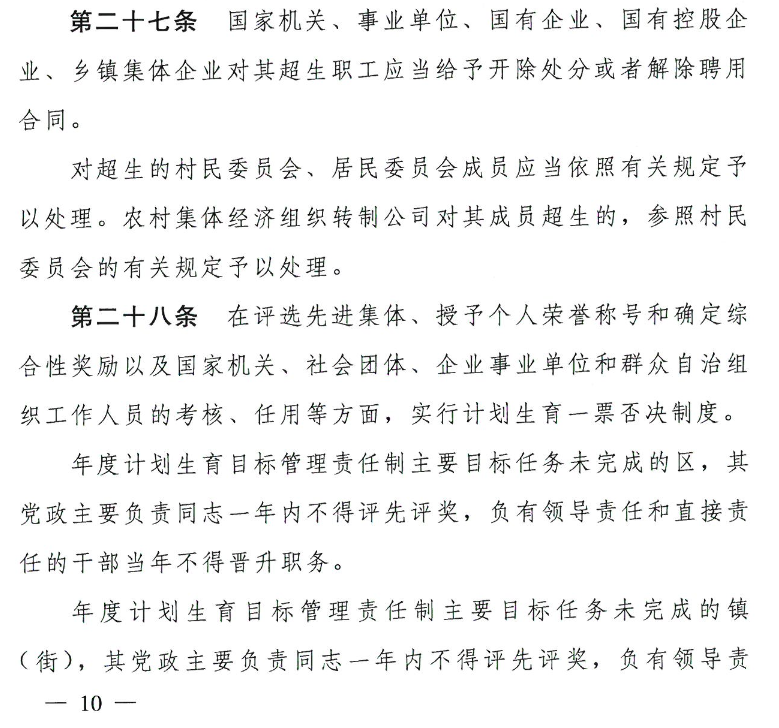 據瞭解,在修訂前,該《規定》在第二十七條明確,對國家機關、事業單位、國有企業、國有控股企業、鄉鎮集體企業對其超生職工應當給予開除處分或者解除聘用合同;對超生的村民委員會、居民委員會成員應當依照有關規定予以處理。