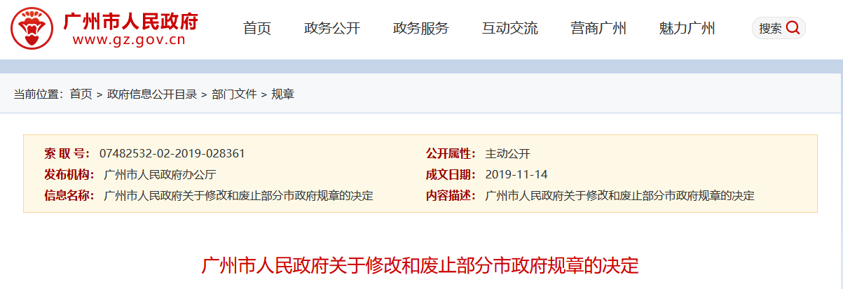 12月9日,廣州市人民政府網站消息,廣州市人民政府發佈《關於修改和廢止部分市政府規章的決定》(下稱:決定),刪去原《規定》第二十七條、第二十八條。