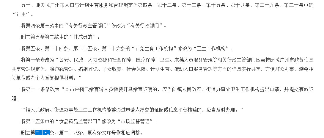 近日,廣州市人民政府官網發佈了修訂後的《廣州市人口與計劃生育服務和管理規定》(下稱:規定),其中刪去“超生即辭退”法規,並將多處“計劃生育工作機構”修改為“衞生工作機構”。