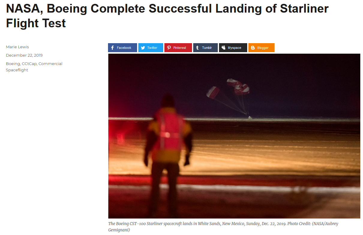 因與火箭分離後沒有進入預定軌道,美國波音公司“星際客機(Starliner)”前往國際空間站的計劃失敗。不過,這艘太空艙在首次試飛後,已於當地時間12月22日上午成功着陸。