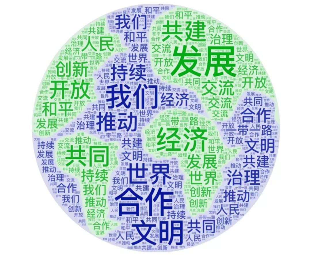 通過對這10篇主旨演講或重要講話的文本進行詞頻分析後發現,**“發展”“合作”“經濟”“文明”“世界”“共同”“和平”**等詞語是文本中出現的高頻詞。其中,“發展”一詞出現的頻率最高,共計達到了229次,而“合作”出現的次數則達到了173次。