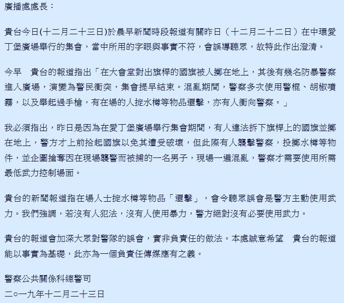 23日,香港警方在其官方網站上放出一則發送給廣播處處長的“傳媒澄清”信函,點名批評香港電台在報道22日的中環愛丁堡廣場集會時所用字眼與“事實不符”,會“誤導聽眾”,因此作出澄清。不過,香港電台並未糾正,還聲稱對警方的“不合理”指控表示遺憾。