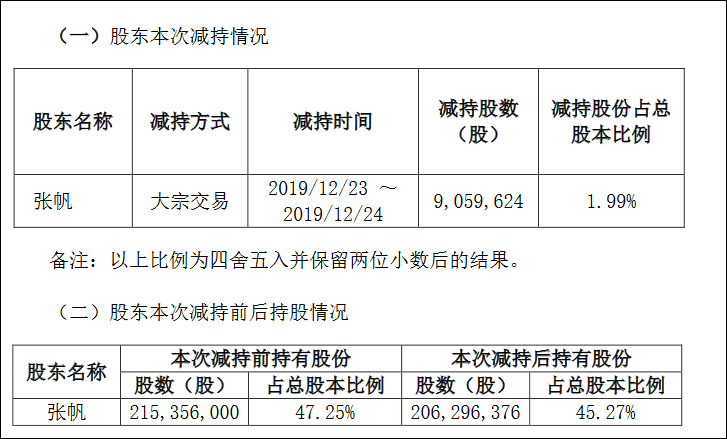 公告中披露,本次權益變動完成後,張帆持股比例降至45.27%,上述權益變動不會導致其控股股東地位發生變化。