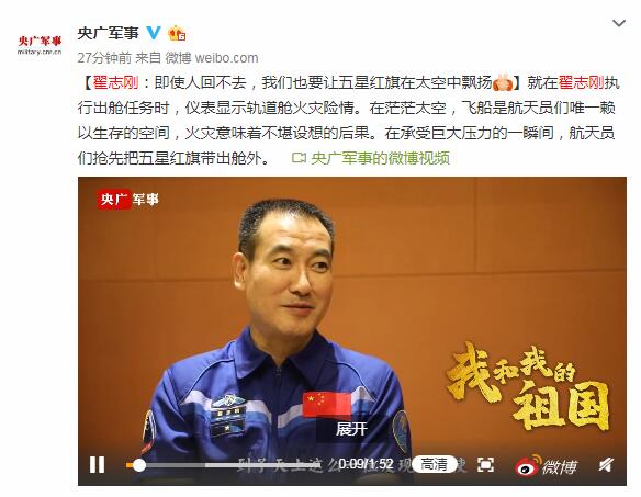 @央廣軍事 12月25日發佈一段視頻:就在翟志剛執行出艙任務時,儀表顯示軌道艙火災險情。在茫茫太空,飛船是航天員們唯一賴以生存的空間,火災意味着不堪設想的後果。在承受巨大壓力的一瞬間,航天員們搶先把五星紅旗帶出艙外。