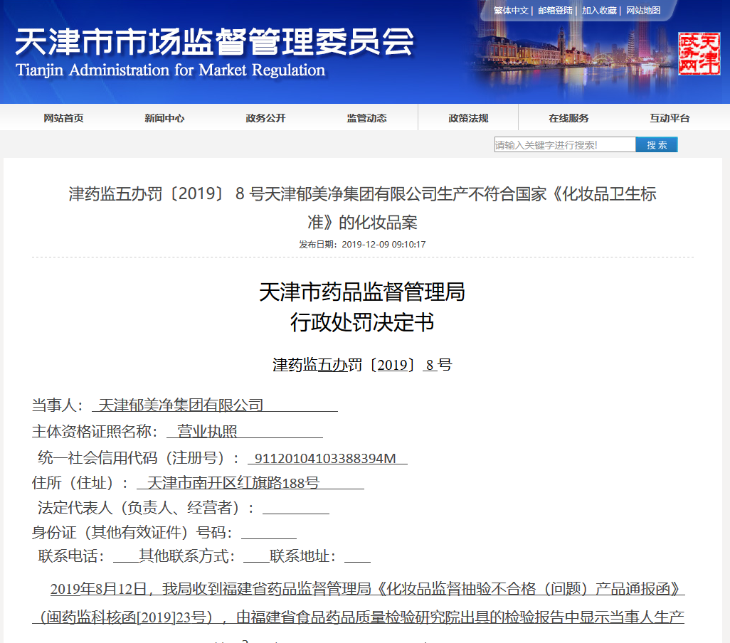 (觀察者網訊)近日,天津市市場監管委員會發布《天津市藥品監督管理局行政處罰決定書》(以下簡稱《決定書》)稱,天津鬱美淨集團有限公司(以下簡稱天津鬱美淨集團)生產的3批次兒童爽身粉被檢出鉛含量超出國家標準。天津市藥監局據此對該公司做出行政處罰。