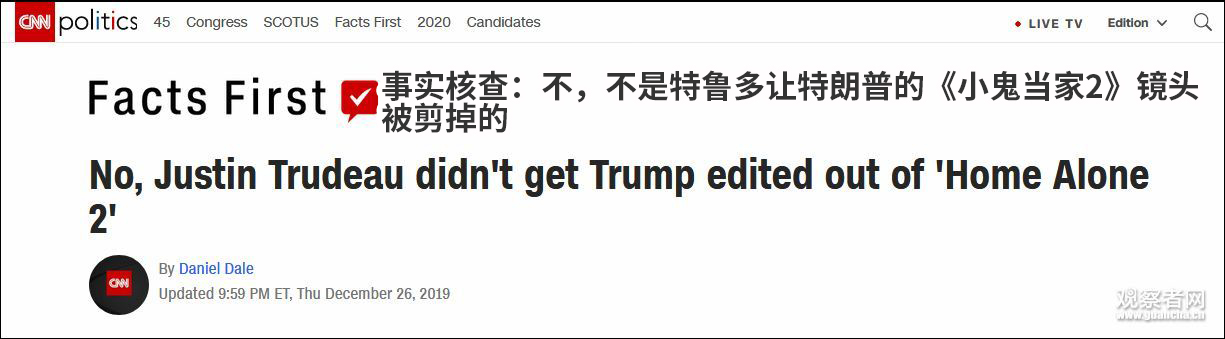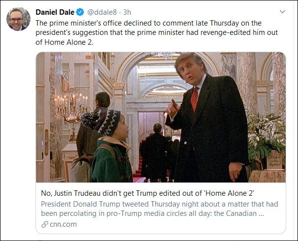 更有趣的是,CNN記者丹尼爾·戴爾(Daniel Dale)發推特表示,就特朗普26日晚間説特魯多把他的客串鏡頭剪掉一事,加拿大總理辦公室拒絕評論。這名記者的推特簡介上顯示,他是專門負責對特朗普以及其它政客做“事實核查”的CNN記者。