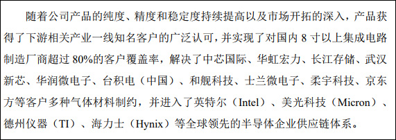 招股書還提到,在極大規模集成電路、新型顯示面板等尖端領域由法國液化空氣集團、德國林德集團等國外企業壟斷的情況下,該公司成功實現了對國內8寸以上集成電路製造廠商超過80%的客户覆蓋率,解決了中芯國際、長江存儲、武漢新芯、京東方等客户多種氣體材料的進口制約,並進入了英特爾、美光、德州儀器等半導體企業供應鏈體系。