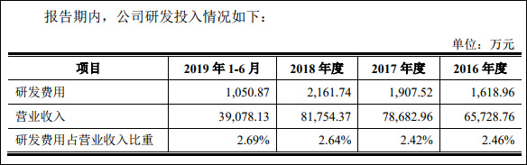 而觀察者網查詢招股書發現,2016年到2019年6月,該公司研發佔營收比重僅為2.46%、2.42%、2.64%和2.69%。截至2019年6月,研發人員人數為68人,佔公司總人數比例為8.19%,是除“其他人員”外人數最少的部門。