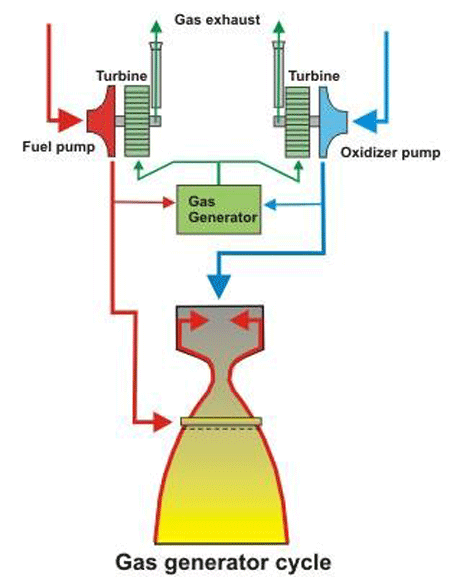 YF-77火箭發動機,採用液氧/液氫推進劑,YF-77火箭發動機採用開式循環,預燃室產生的燃氣,分別驅動燃料泵和渦輪泵(這樣的設計是考慮到密封性問題,防止氫氣與氧氣接觸,產生爆炸),驅動渦輪後的廢氣直接排到發動機外面