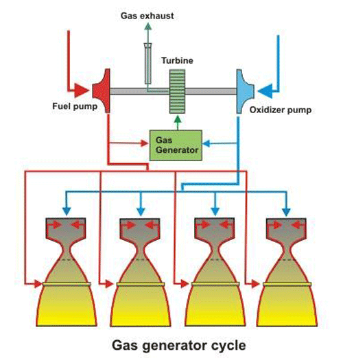 “長征三號”第三級YF-73發動機,由1台渦輪泵和4個獨立的推力室並聯,渦輪泵排氣加熱氫氣和氦氣,分別給氫、氧貯箱增壓