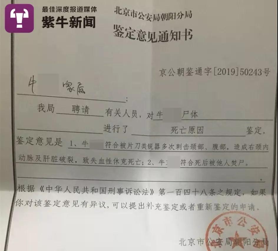 12月26日,劉先生告訴紫牛新聞記者一個最近情況:家屬拿到了北京市公安局朝陽分局出具的《鑑定意見通知書》。這份通知書顯示,牛某傑符合被片刀類鋭器多次刺擊頸部、腹部,造成右頸內動脈及肝臟破裂,致失血性休克死亡;符合死後被他人焚屍。通知書落款處蓋有北京市公安局朝陽分局的公章。