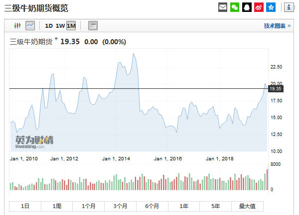 觀察者網查詢美國芝加哥商品交易所三級牛奶期貨價格發現,美國牛奶價格自今年1月起從每百磅14美元上漲至目前的每百磅19.35美元,漲幅高達38%,但距2014年9月的最高點每百磅24.5美元還有相當大的空間。