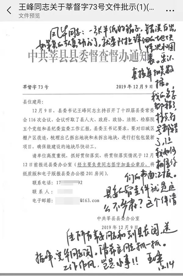 除了改正其中的各處錯誤外,王峯還在該報告上批示説,“一張半紙的稿子,錯誤百出,如果真的認真研究了,就要附上詳細的地塊情況和圖表。要認真核算相關的數據。我的名字都錯了,標點符號都錯了,讓我如何相信你們的書面彙報。縣委的督查件就是這麼不嚴肅?這個件請傳所有常委同志和副縣長閲,請xx同志抓一抓,工作作風,豈是小事!!”